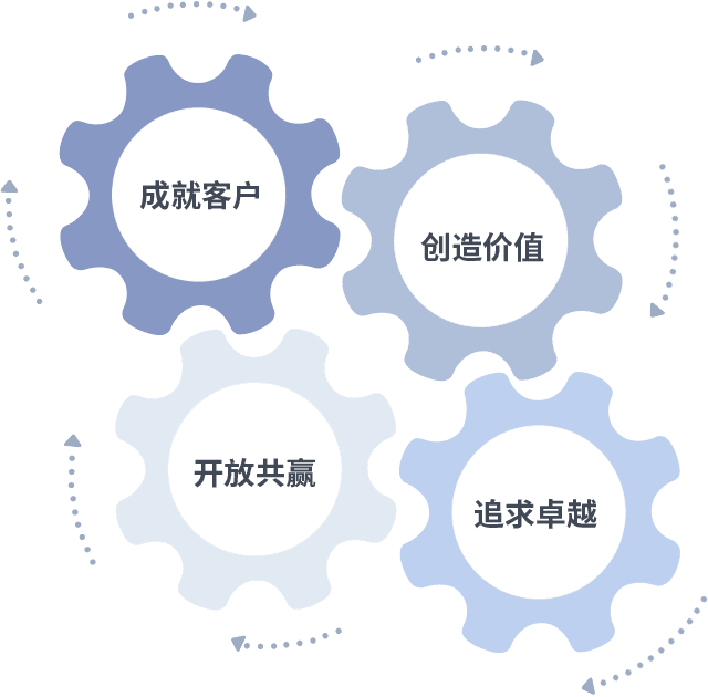 成就客户是一切决策的出发点,,,创造价值是衡量所有工作的标准,,,追求卓越是我们做事做人的态度,,,开放共赢是我们的格局也是最终的结果。。。。价值观的齿轮环环相扣,,,,推动着组织里的每个人不断向前。。。。
